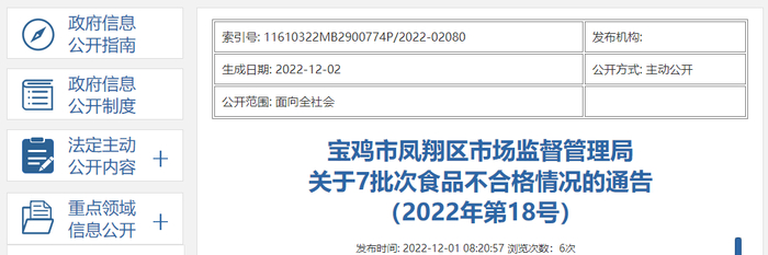 陕西省宝鸡市凤翔区市场监管局关于7批次食品不合格情况的通告(2022年第18号)
