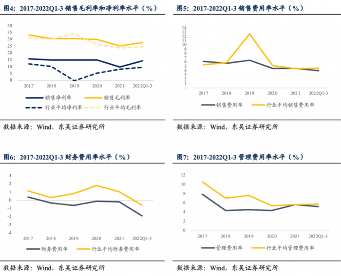 ■公司销售净利率和毛利率稳中有降,销售费用率、财务费用率和管理费用率下降。2017-2021年,公司销售净利率分别为15.97%、15.04%、15.04%、15.10%和9.92%,销售毛利率分别为33.48%、30.65%、30.62%、30.06%和25.31%。