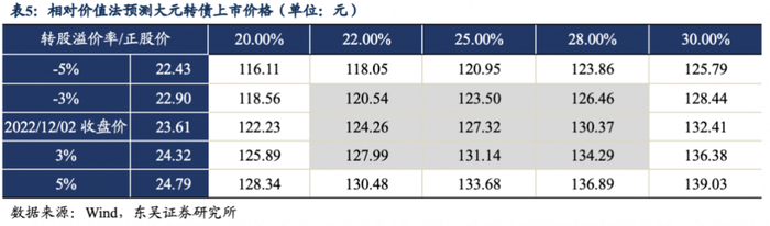 综合可比标的以及实证结果,考虑到大元转债的债底保护性一般,评级和规模吸引力一般,我们预计上市首日转股溢价率在25%左右,对应的上市价格在120.54~134.29元之间。