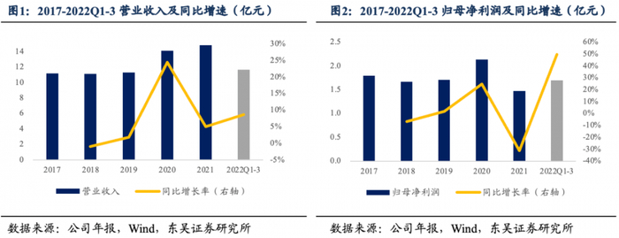 ■2017年以来公司营收稳步增长,2017-2021年复合增速为7.22%。自2017年以来,公司营业收入总体呈现稳步增长态势,同比增长率“倒V型”波动,2017-2021年复合增速为7.22%。2021年,公司实现营业收入14.84亿元,同比增加5.04%。与此同时,归母净利润也不断浮动,2017-2021年复合增速为-4.83%。2021年实现归母净利润1.47亿元,同比减少31.02%。