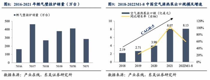 俄乌冲突致欧洲能源危机,屏蔽泵下游维持高景气度。大元泵业主营产品热水循环屏蔽泵是空气源热泵、燃气壁挂炉和燃气热水器的核心零部件。国内利好方面,2017年,《京津冀及周边地区2017年大气污染防治工作方案》推动北方地区冬季清洁能源取暖,燃气壁挂炉和空气源热泵销量大增。BSRIA数据显示,空气源热泵(含水机和热风机)市场规模已从2014年的130万台增长至2019年的250万台左右,年均复合增速达14.5%。海外利好方面,2022年初以来,在俄乌冲突背景下欧洲陷入能源危机,供暖需求旺盛。同时,欧盟委员会发布《能源网数字化计划》,要求在未来5年内新增安装热泵1000万台,欧洲空气源采暖热泵市场需求旺盛提升中国热泵出口行业景气度。2021年中国空气源热泵出口额为8.07亿美元,同比增长102.76%。2022年1-8月累计出口额达到8.13亿美元,超过去年全年水平。