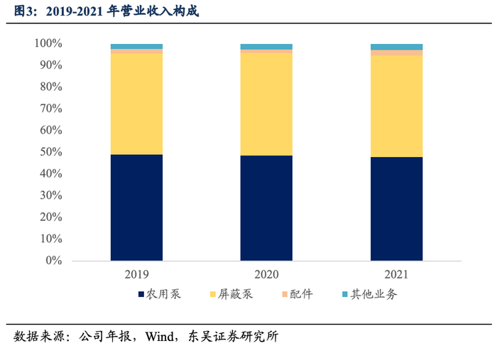■公司营业收入主要来源于农业泵和屏蔽泵,营收结构稳定。2019年以来,农业泵和屏蔽泵营收占比均维持在45%以上,构成大元泵业主营收入的绝对来源。公司配件和其他业务营收占比较小,合计约5%。