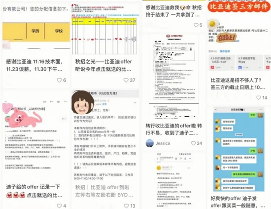 同明哲一样,在小红书、牛客等社交平台中,大批名校毕业生、普通院校学生分享着自己火速拿下比亚迪offer的经历,甚至向着挑战最短时间拿下比亚迪offer“卷”了起来。
