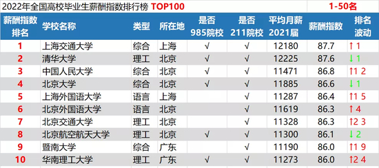 2022年全国高校毕业生薪酬指数排行榜前10名的高校均为985或211院校