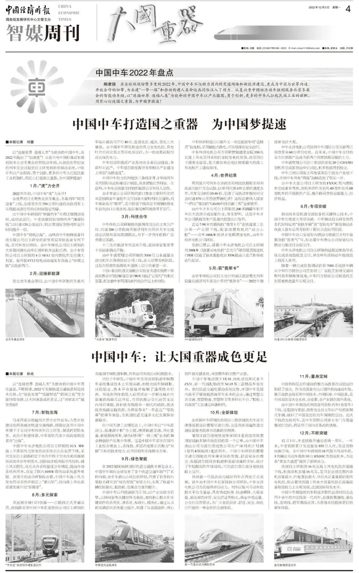 以“连接世界造福人类”为使命的中国中车勇往直前,不断探索,2022年发挥轨道交通装备制造技术优势,在“绿色发展”“低碳智造”“跨国之旅”等方面持续突破,让大国重器成色更足,让“国家名片”越发亮丽!