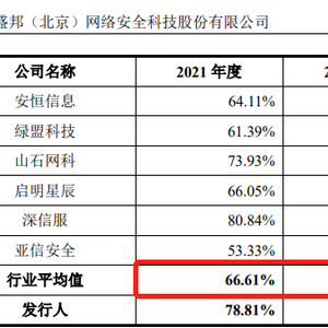 据招股书披露,报告期内,盛邦安全研发投入金额分别为1486.30万元、2489.13万元和3870.95万元,占各期营业收入比例分别为13.93%、16.38%、19.11%。同期,同行业可比公司研发费用率均值分别为20.85%、21.43%和23.62%。