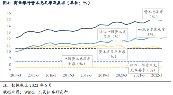 预计未来商业银行的整体资本储备盈余会继续走扩,需着重关注核心一级资本充足率的盈余状况。图4显示了近8年商业银行的资本充足率的走势,可以看出资本充足率和一级资本充足率呈现逐年上升的趋势,资本储备盈余也随之上行;核心一级资本充足率则围绕10%-11%波动,整体的资本储备盈余基本保持在2.5%-3.5%之间。说明二级资本工具(二级资本债)和其他一级资本工具(永续债)的发行阻碍较小,因此存量规模稳定上升导致银行的二级和其他一级资本储备盈余较大;而核心一级资本的获取途径有限,尤其对于非上市银行,因此我们未来需重点关注核心一级资本储备的盈余情况以及次级债风险权重变化对核心一级资本充足率的影响。