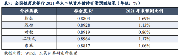 其次,为了进一步探究次级债风险权重变动对商业银行投资二级资本债的影响,我们针对其余12家全国性商业银行(1家国有行+11家股份行)进行了直观测算。已知2021年末每家全国性商业银行的资本净额和风险加权资产,由于信息披露的局限性,我们无法得知2021年末每家全国性商业银行投资二级资本债的规模,只能通过全国性商业银行的整体资本债投资比例来预测。首先,我们通过历史各季度的二级资本债投资规模占自营投资总规模的比例(后简称“资本债投资比例”)来推算2021年末的比例。图6显示了2014-2020年各季度全国性商业银行的资本债投资比例,可以发现该比例基本呈现逐年上升的趋势。我们尝试运用各类函数进行外推,结果如表7所示,二项式的拟合度相对较高,因此推测全国性商业银行的整体资本债投资比例为1.17%。其次,假设12家全国性商业银行在2021年末均以其自营投资额的1.17%来投资二级资本债,在已知每家银行自营投资额的基础上,可以计算出权重调整前后的资本充足率变化。