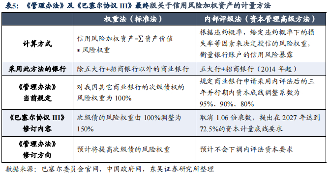 《管理办法》中信用风险加权资产的计算框架与《巴塞尔协议》非常相似,中国很可能参考《巴塞尔协议III》最终版做出相应调整。中国《管理办法》在信用风险的计算方面很大程度上参考了《巴塞尔协议》,规定可以采用权重法(即标准法)或内部评级法(即资本管理高级方法)来计量信用风险加权资产。因此,《管理办法》很有可能依据最终版中的修订内容做出相应调整。