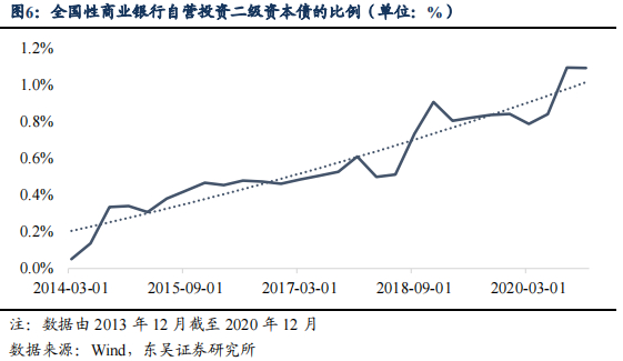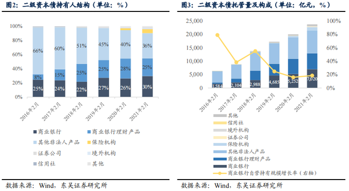 银行自营是二级资本债的重要持有者,其投资需求的变化或将重塑资本债需求端结构。在二级资本债持有人结构中,商业银行自营和非法人产品(包括商业银行理财产品和其他基金类产品)占总托管规模的90%以上。近年来银行自营的规模占比整体呈现上升趋势,在2021年2月达到了30%。同时,银行持有二级资本债的绝对规模也在逐年提升,2020和2021年的增长率稳定在20%左右。显然,银行自营在二级资本债的需求端占据较为重要的地位,一旦修订规则在中国落地,次级债风险权重的提高将增加银行的资本占用,或将减小银行自营对于二级资本债的投资需求从而改变资本债市场的供需格局。