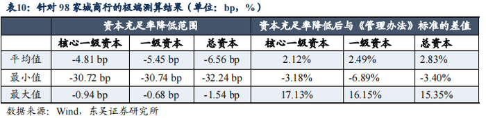 考虑到全国性商业银行的资本债投资比例受到较多外部因素的影响,我们还针对每家全国性商业银行进行了极端测算。《管理办法》要求商业银行对未并表金融机构的小额少数资本投资不能超过核心一级资本净额的10%,因此我们可以假设所有银行均用其核心一级资本净额的10%上限投资其他商业银行的二级资本债,来测算极端情况下全国性商业银行资本充足率的变动情况。