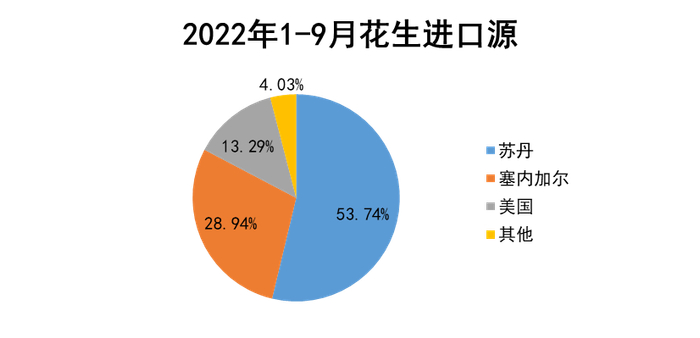 进口数量上,从年内季节性来看,3-6月份是我国进口花生米需求的高峰期,年度峰值出现在这段时间,下半年的需求减弱。从年度对比来看,今年1-9月累计进口54.97万吨,同比去年91.41万吨下降39.87%。我国花生2019、2020、2021年度进口量分别为45.66万吨、98.92万吨和94.78万吨,今年花生进口较前两年大幅下降,主要原因有三,一是疫情导致船期不稳定;二是进口利润下降,进口花生性价比不如以往;三是苏丹、塞内加尔两个主产国花生产量下降。不过今年的花生总进口较2019年有所增加,且从下半年进口来看,进口量有所复苏,因此明年的花生进口量仍有增加的可能。