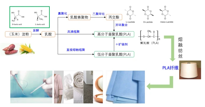 在实际应用中,往往会同时用到化学法和生物法。比如工业生产PLA时,一般先用生物法把淀粉发酵成乳酸,再经化学法将乳酸缩聚制成低聚物,然后在催化剂的作用下制成丙交酯,在真空中蒸馏提纯后进行催化开环缩聚制得聚乳酸[13]。
