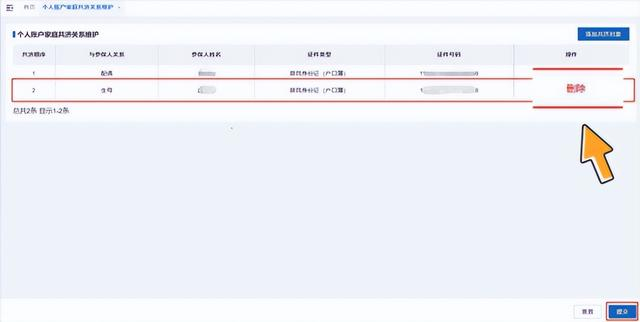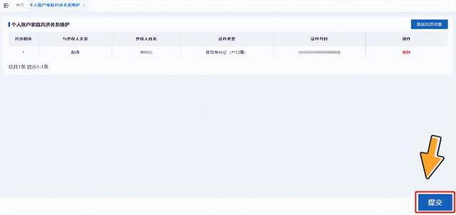 10.删除共济对象成功后,列表会展示当前有效的共济对象信息,不再展示已删除的共济对象信息,确认无误后点击【提交】按钮。