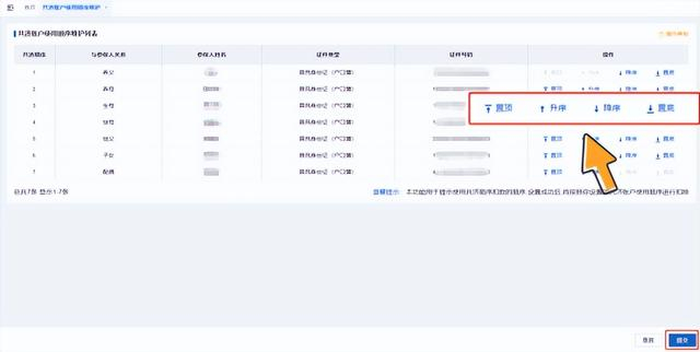 04.系统展示当前共济账户使用顺序维护列表,根据实际情况点击【置顶】、【升序】、【降序】、【置底】调整共济账户顺序,调整完毕后点击【提交】按钮。