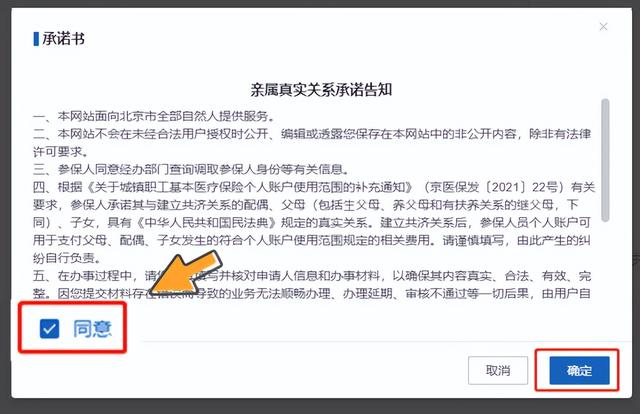 02. 查看【亲属真实关系承诺告知】,勾选同意,点击【确定】按钮。