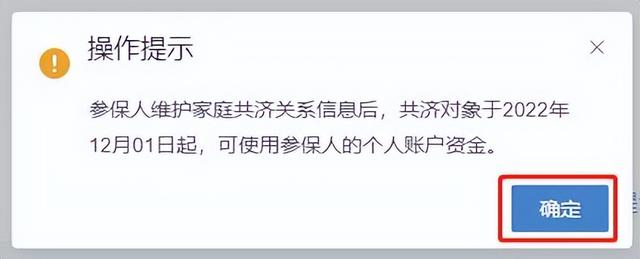 03. 查看【操作提示】:参保人维护家庭共济关系信息后,共济对象于2022年12月01日起,可使用参保人的个人账户资金。点击【确定】按钮。