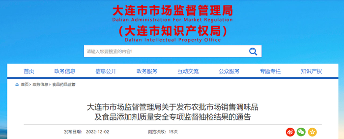 中国质量新闻网讯 2022年12月2日,大连市市场监督管理局网站公布农批市场销售调味品及食品添加剂质量安全专项监督抽检结果。