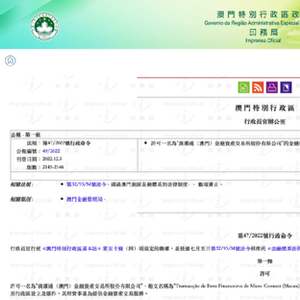据澳门特别行政区政府印务局12月5日消息,澳门日前许可“滴灌通(澳门)金融资产交易所股份有限公司”在澳门特别行政区设立及运作,所营业务为提供金融资产交易服务。