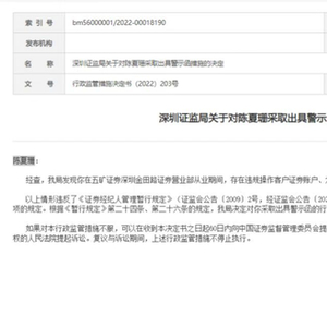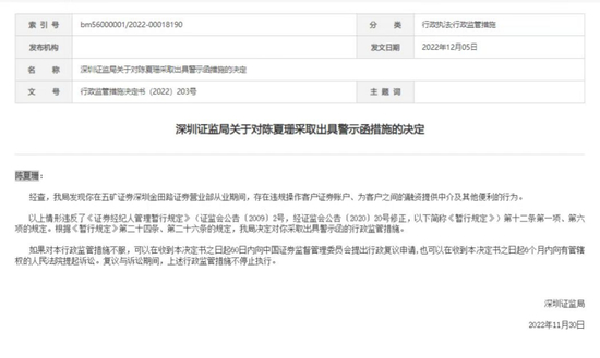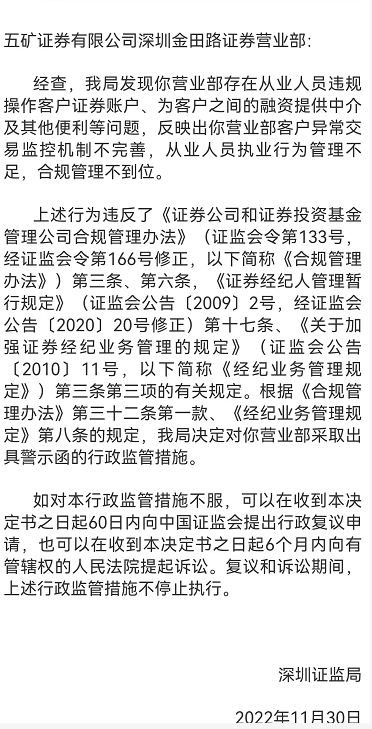 一则指向陈夏珊所在分支机构。因存在从业人员违规操作客户证券账户、为客户之间的融资提供中介及其他便利等问题,五矿证券深圳金田路证券营业部被指客户异常交易监控机制不完善,从业人员执业行为管理不足,合规管理不到位。对此,深圳证监局决定对该营业部采取出具警示函的行政监管措施。