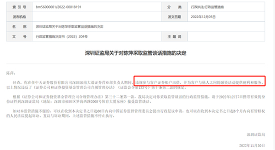 无独有偶,就在同一天,中天证券同样因类似原因被深圳证监局点名,被罚对象是营业部老总。深圳证监局罚单显示,陈萍在任中天证券深圳深南大道证券营业部负责人期间,违规参与客户证券账户出借,并为客户与他人之间的融资活动提供便利和服务。深圳证监局据此决定对陈萍采取监管谈话的行政监管措施。