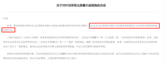 同样是12月5日,金元证券及一营业部负责人叶羽也被出具警示函,叶羽是金元证券瑞安安阳路证券营业部负责人,因违规兼职被罚,金元证券的问题则是知情不报。