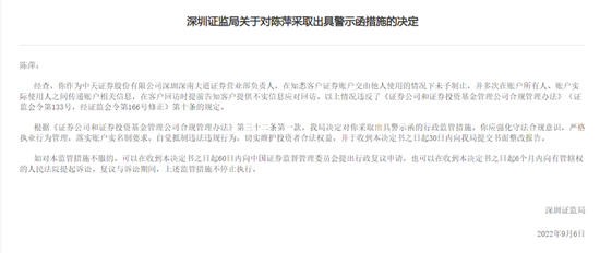 今年9月,陈萍及所在营业部也被深圳证监局出具警示函,被罚原因是陈萍在知悉客户证券账户交由他人使用的情况下未予制止,并多次在账户所有人、账户实际使用人之间传递账户相关信息,在客户回访时提前告知客户提供不实信息应对回访。