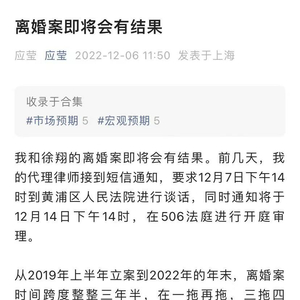12月6日,应莹在其个人微信公众号发文称,其与徐翔的离婚案即将有结果。根据文章内容,应莹代理律师日前接到短信通知,被要求于12月7日14时到黄浦区人民法院进行谈话,同时被通知将于12月14日14时,在506法庭进行开庭审理。