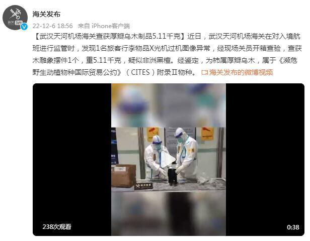近日,武汉天河机场海关在对入境航班进行监管时,发现1名旅客行李物品X光机过机图像异常,经现场关员开箱查验,查获木雕象摆件1个,重5.11千克,疑似非洲黑檀。经鉴定,为柿属厚瓣乌木,属于《濒危野生动植物种国际贸易公约》(CITES)附录Ⅱ物种。