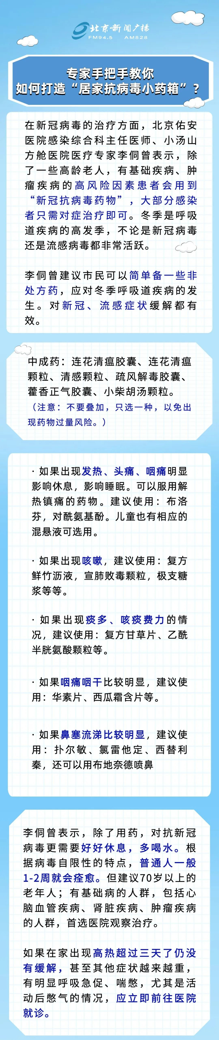 中成药:连花清瘟胶囊、连花清瘟颗粒、清感颗粒、疏风解毒胶囊、藿香正气胶囊、小柴胡汤颗粒。注意:不要叠加,只选一种,以免出现药物过量风险。(北京佑安医院感染综合科主任医师、小汤山方舱医院医疗专家李侗曾)