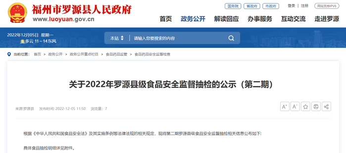 中国质量新闻网讯 12月5日,福州市罗源县人民政府网站公示2022年罗源县级食品安全监督抽检信息(第二期)。