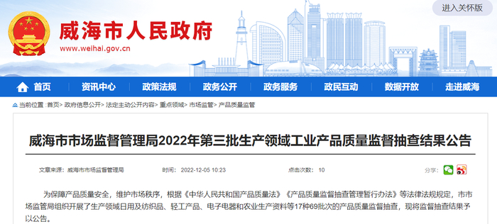 山东省威海市市场监管局公布2022年第三批生产领域工业产品质量监督抽查结果