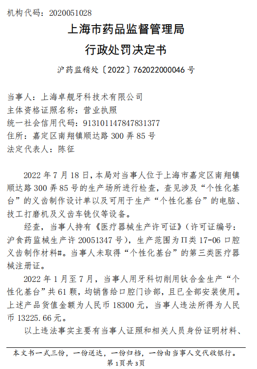 沪药监稽处〔2022〕762022000046号处罚文书显示,2022年7月18日,该局对上海卓舰牙科技术有限公司位于上海市嘉定区南翔镇顺达路300弄85号的生产场所进行检查,查见涉及“个性化基台”的义齿制作设计单以及可用于生产“个性化基台”的电脑、技工打磨机及义齿车铣仪等设备。经查,当事人未取得“个性化基台”的第三类医疗器械注册证。2022年1月至7月,当事人用牙科切削用钛合金生产“个性化基台”共61颗,均销售给口腔门诊部,且已全部安装使用。上述产品货值金额为人民币18300元,当事人违法所得为人民币13225.66元。