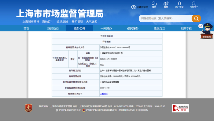 上海卓舰牙科技术有限公司涉嫌生产未取得医疗器械注册证的第三类医疗器械被罚36万余元