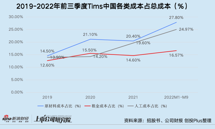 如星巴克一般强调“第三空间”,且超92%门店集中在一线和新一线城市,近45%门店选址于核心商圈商场内,这意味着Tims中国的整体经营成本较高。2022年前三季度,公司自营门店的原材料、租金和人工成本分别为2.25、1.34和2.02亿元,一举吞掉报告期内总营收的近80%。结合往期财报数据不难看出,除了租金成本占总成本比例相对稳健,原材料和人工成本占比都在疫情反复、门店增加的过程中快速提升。