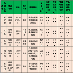 20款棕纤维弹性床垫比较试验结果汇总表