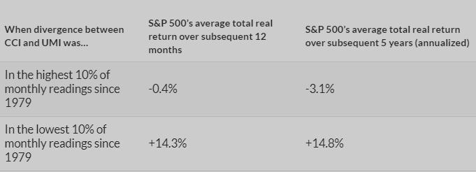 为了衡量这种差异,该指标集中在世界大型企业联合会的消费者信心指数(CCI)和密歇根大学的消费者信心调查(UMI)。据InvesTech Research的詹姆斯•斯塔克(James Stack)说,虽然这两个指数衡量的内容有一些重叠之处,但侧重点却有很大不同。Stack表示,消费者物价指数更多地反映了消费者对整体经济的态度,而UMI则更多地考虑了消费者当前的个人情况。
