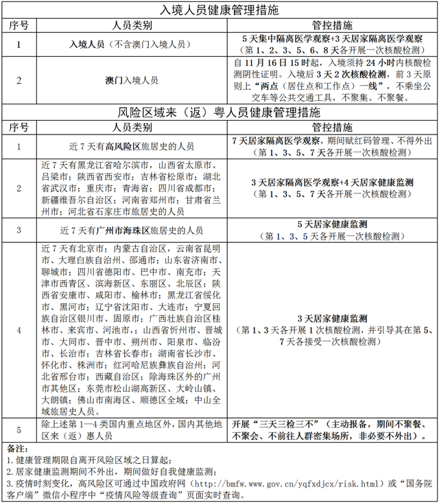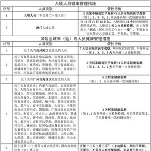 高风险区、疫情传播严重地等来(返)惠人员严格按照我市防疫政策配合做好健康管理(详见以下表格),其他地区来(返)惠人员抵惠后落实“三天三检三不”(核酸三天每天一检,期间不聚餐、不聚会、不前往人群密集场所,谢绝访客)。