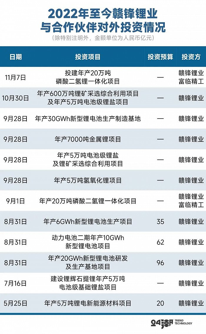 为了构建一体化战略新格局,2022年至今赣锋锂业还发动了前所未有的扩张攻略,据24超统计,2022年至今赣锋锂业对外至少公布了12个投资计划,涵盖锂矿采选、锂盐、锂电材料、锂电池制造等多个领域,总投资可能超300亿元。
