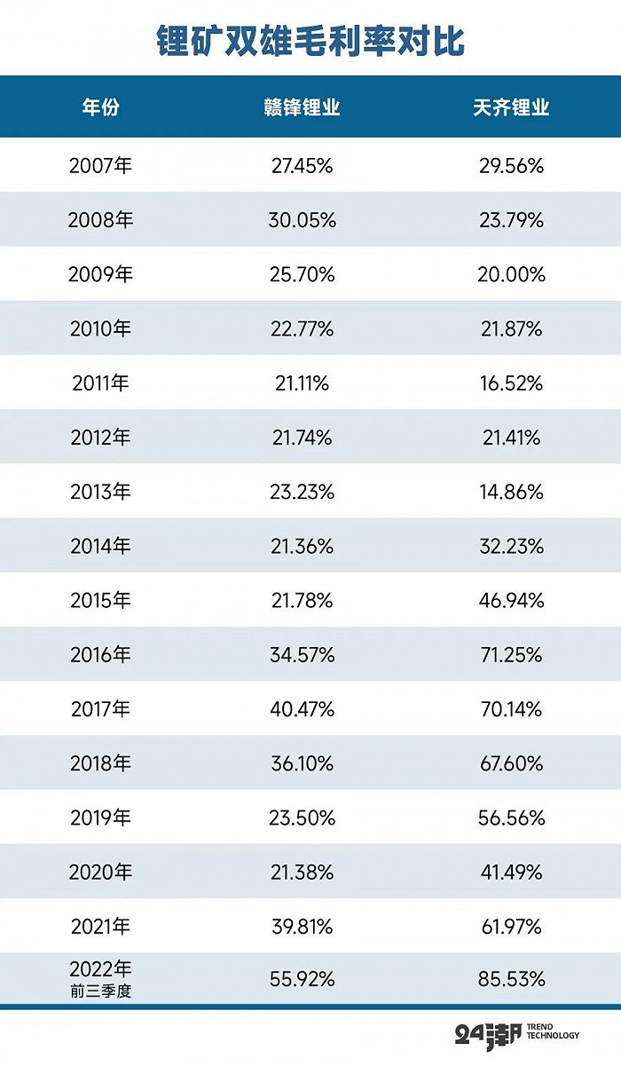 尽管赣锋锂业在营收层面已占据领先优势,但若论产品盈利能力,则是天齐锂业更胜一筹。