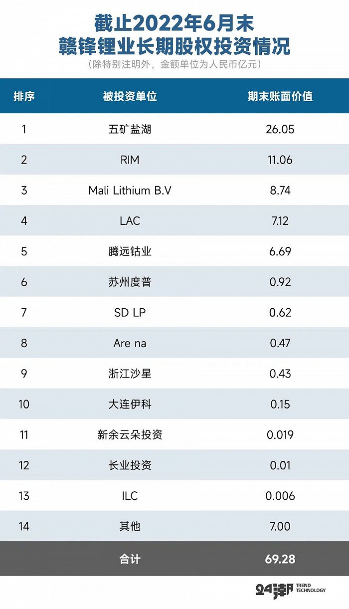 如下表所示,截止2022年9月末,天齐锂业与赣锋锂业 “长期股权投资” 规模分别达225.55亿元和84.13亿元。