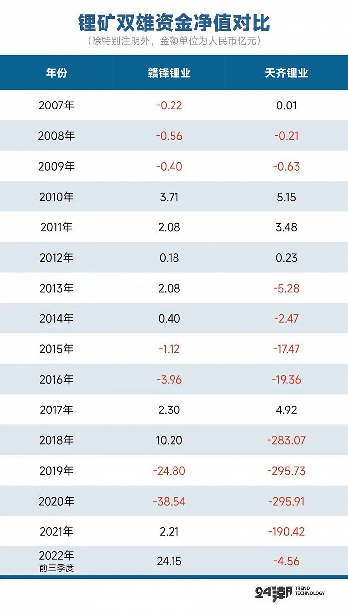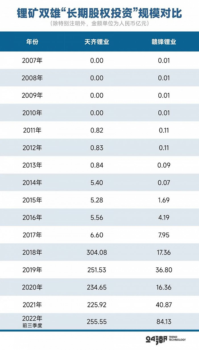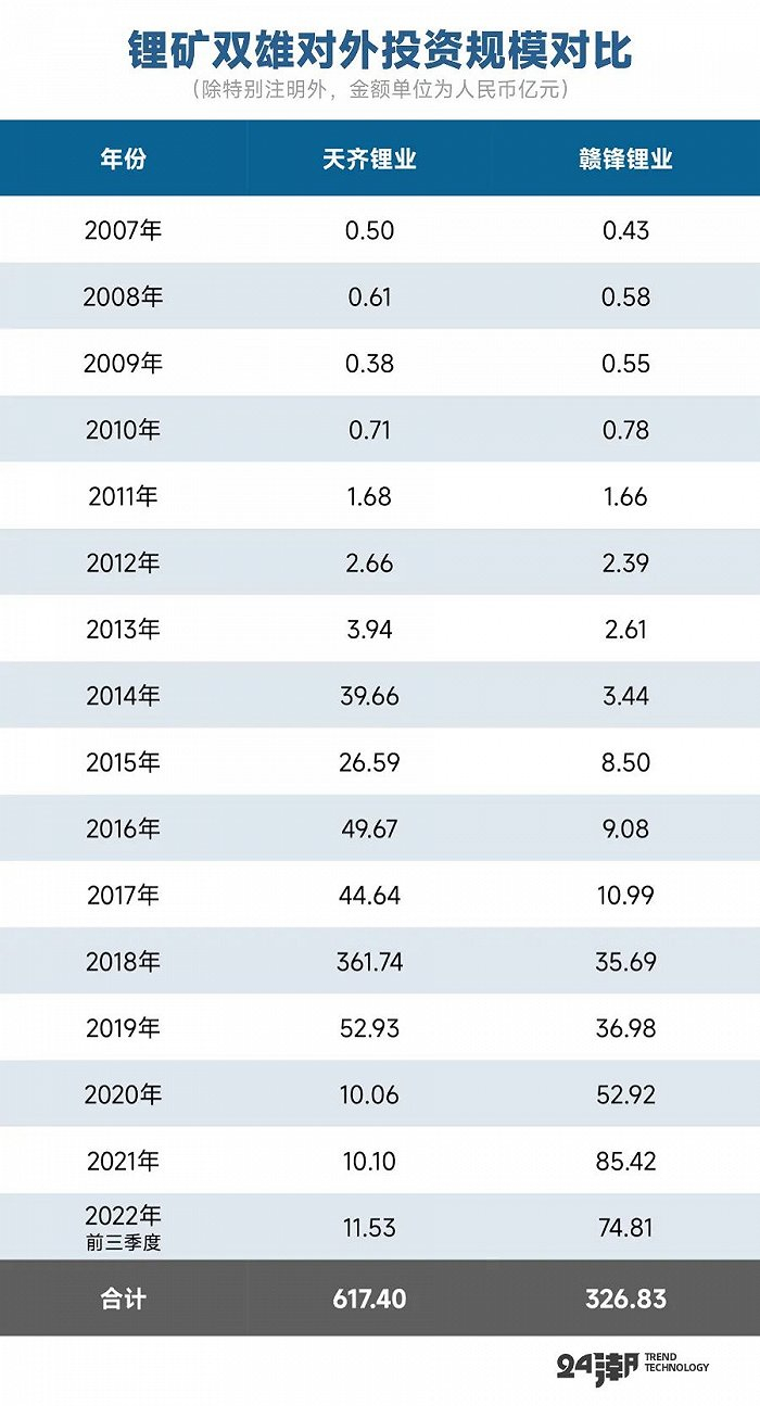 而持续且凶猛的扩张策略,无疑是锂业双雄加速崛起的关键因素之一。据24潮统计,在2007年-2022年前三季度期间,赣锋锂业与天齐锂业对外投资规模合计达944.23亿元。