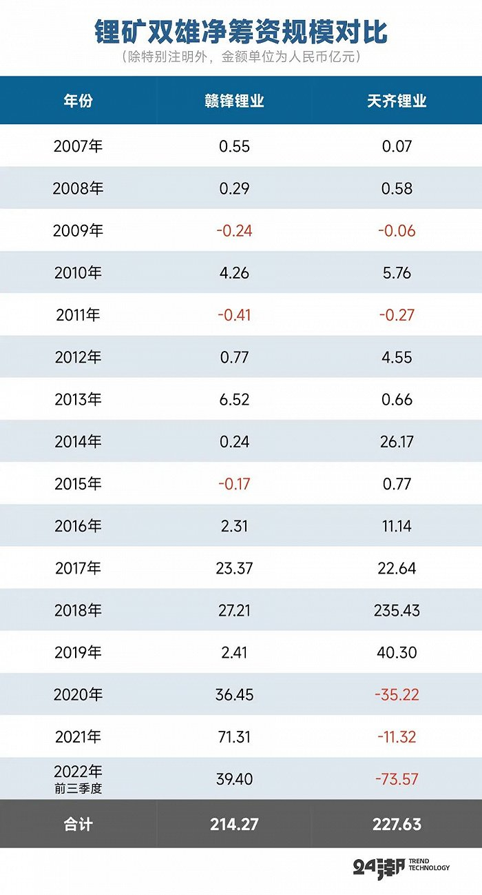 笔者统计数据发现,整体来看,过去十六年间,无论是造血能力还是筹资实力,天齐锂业都更胜一筹。据24潮统计,2007年-2022年前三季度,天齐锂业经营现金流净额与筹资活动现金流净额分别为262.54亿元和227.63亿元,仅两项就为其提供了490.17亿元的净现金流,这较同期赣锋锂业高出了132.19亿元。