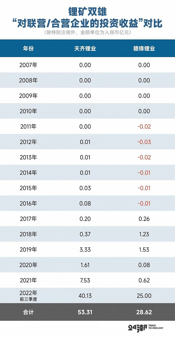 据24潮统计,2022年前三季度赣锋锂业与天齐锂业 “对联营/合营企业的投资收益” 分别达历史最高值的40.13亿元和25亿元。