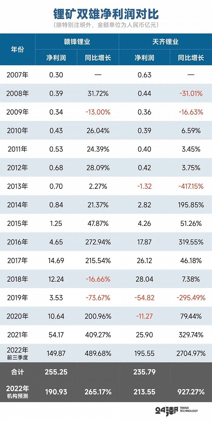 2021年以来,锂业双雄可谓 “出尽风头” ——两者营收与净利润均已连续两年实现超100%以上超高速增长,2022年前三季度两巨头净利润规模更是史无前例的双双突破100亿大关。