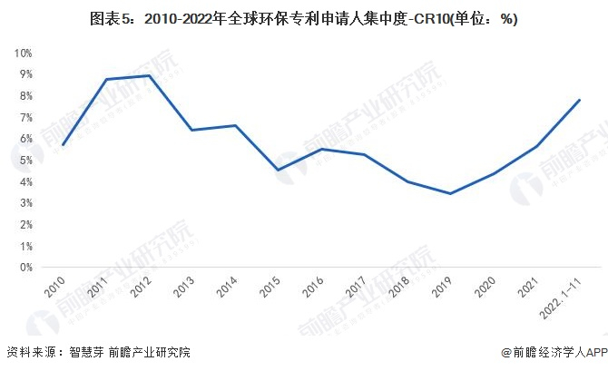 2010-2021年,全球环保专利申请人CR10呈现波动递增趋势,由2010年的5.71%波动下降至2021年的5.62%。整体来看,全球环保专利申请人集中度较低,且集中度呈现波动下降趋势。截至2022年11月24日,全球环保专利申请人集中度为7.80%。