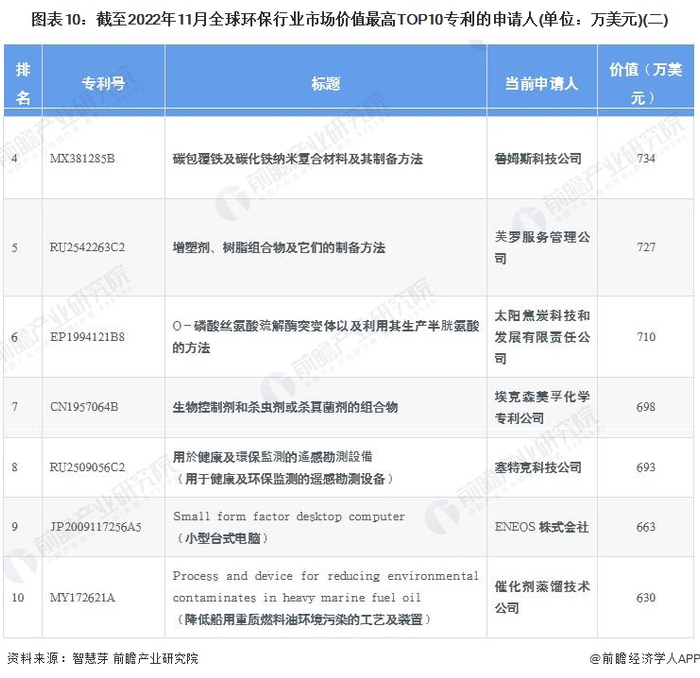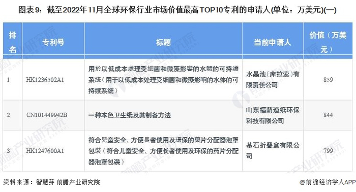 截至2022年11月24日,全球环保市场价值最高TOP10专利中,市场价值最高的专利为用於以低成本處理受細菌和微藻影響的水體的可持續系統(用于以低成本处理受细菌和微藻影响的水体的可持续系统),专利价值为859万美元;一种本色卫生纸及其制备方法排名全球环保行业专利市场价值第二位,专利市场价值为844万美元。