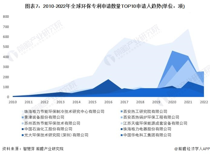 截至2022年11月24日,全球环保行业专利申请数量TOP10申请人分别是珠海格力节能环保制冷技术研究中心有限公司、西安热工研究院有限公司、景津装备股份有限公司、西安西热锅炉环保工程有限公司、苏州西热节能环保技术有限公司、江苏天楹环保能源成套设备有限公司、中国石油化工股份有限公司、珠海格力电器股份有限公司、光大环保技术研究院(深圳)有限公司和中国华电科工集团有限公司。