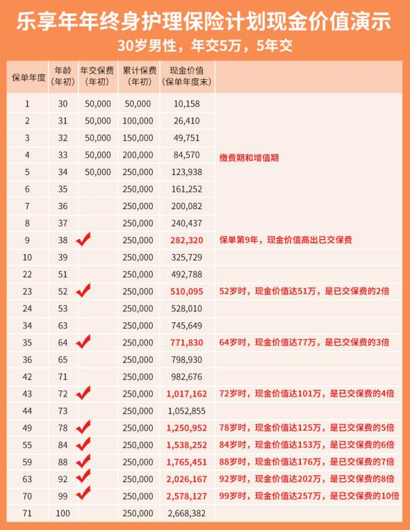 高增长是乐享年年的“必杀技”,一时可能看不出什么差别,但到长期看时有很大差异,梧桐树保险规划师以30岁男性,年交5万,交5年为例替我们做了详细测算。64周岁时,现金价值达77万,是已交保费的3倍;78周岁时,现金价值达到125万,是已交保费的5倍;如果百岁人生活到99岁,现价更可达到已交保费的10倍!长期优势相当明显。