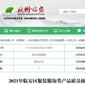 杭州市临安区公示2021年服装服饰类产品质量抽查检验结果